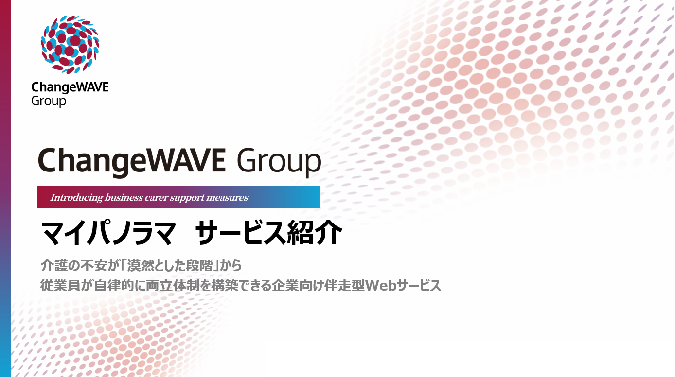本資料では、両立支援Webサービス「マイパノラマ」について、企業における活用イメージを中心に紹介しています。介護がまだ差し迫った問題ではない従業員も含め、日常的に情報へアクセスできる環境を整えることで、早期の気づきや準備につなげる考え方を解説しています。セミナーや相談窓口と組み合わせた支援体制や、人事部門が施策の効果や傾向を把握するための視点も整理されており、両立支援の「次の一手」を検討する際の参考となる資料です。
