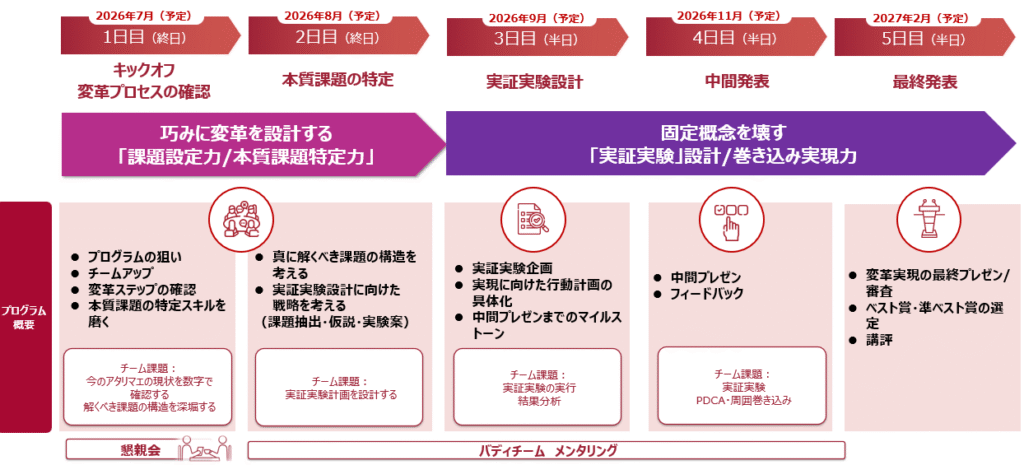 - プログラムの狙い確認、チームアップ、変革ステップの確認、本質課題の特定スキルを磨く