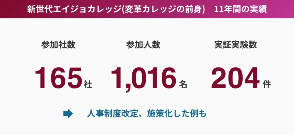 変革カレッジの前身である「新世代エイジョカレッジ」では10年以上にわたり165社・1,000名超が参加し、キリングループ、三井住友海上火災保険、三菱地所プロパティマネジメントなど、多くの企業で制度改革にもつながる成果を上げています。