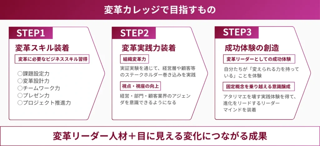 そのプロセスで、変革を推進するスキル・視点・自信を育てます。