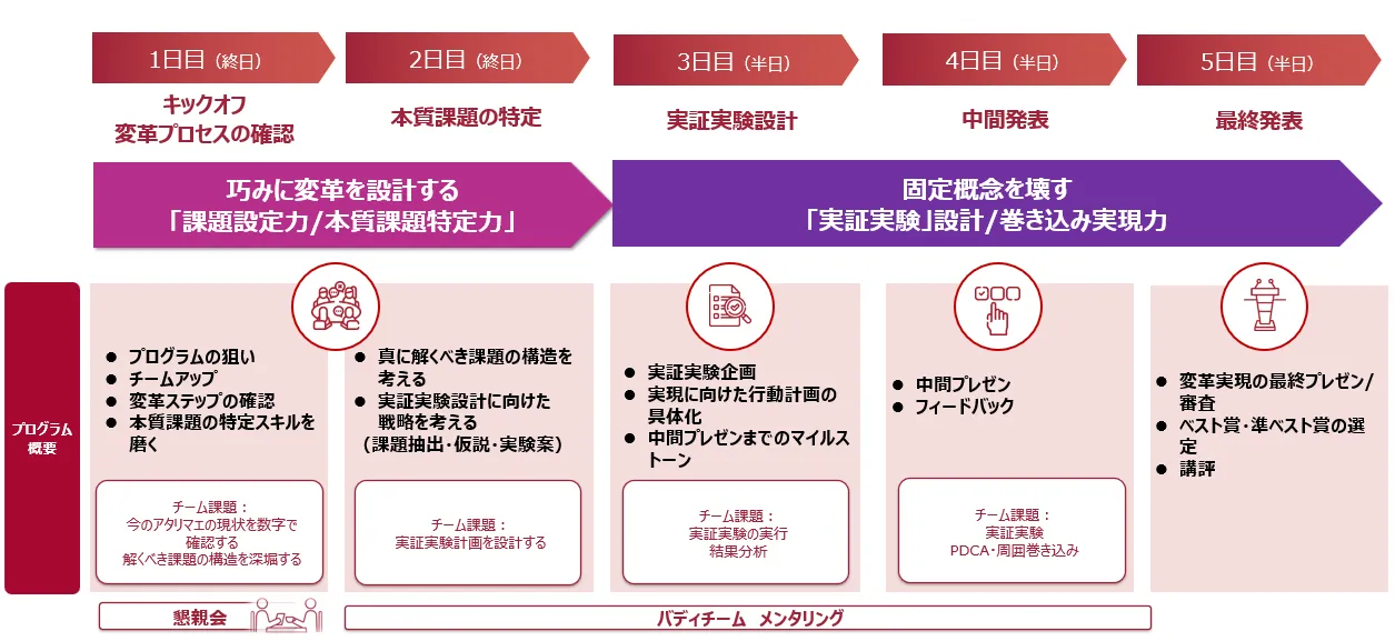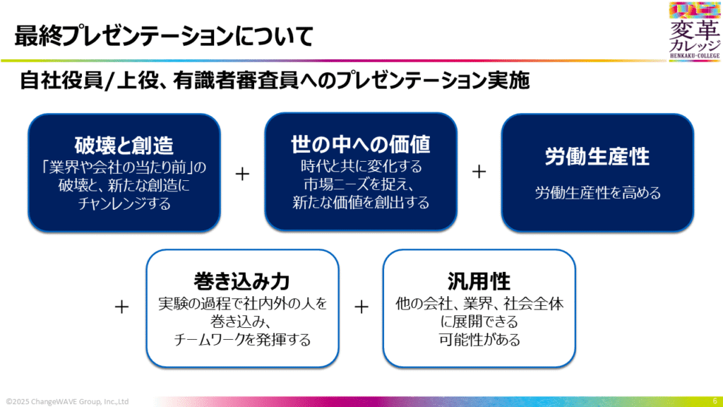 「変革カレッジ」は、参加者が現場で感じる自社の課題解決をテーマに“実証実験”を行い、変革を実現できるリーダーを育成することを目的とした実践型プログラムです。