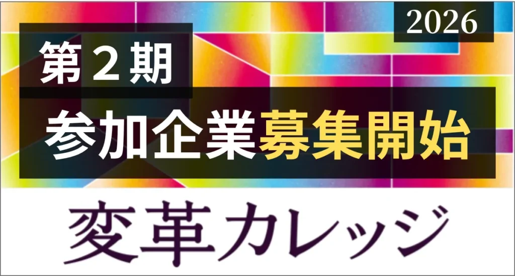変革カレッジ 第二期募集! お問い合わせ × 早期申込特別価格は2026年6月5日(金) 「変革を自分ごととして捉え、動けるリーダーを育てたい」「研修で終わらせず、実際に組織を変えていきたい」 そんな想いを持つ企業に向け … 続きを読む 変革カレッジ第2期 参加企業募集開始!実証実験で次世代リーダーを育てる8ヶ月間